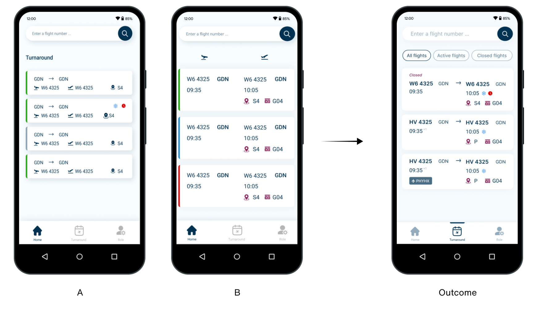 The final design focuses on clarity and efficiency. The new tab-based navigation provides quick access to the main sections, while the redesigned turnaround table uses grouping, hierarchy, and filters to make flight information easier to scan and manage.